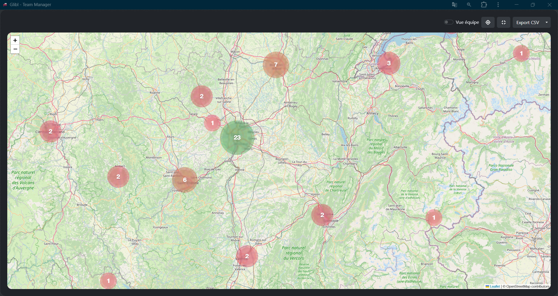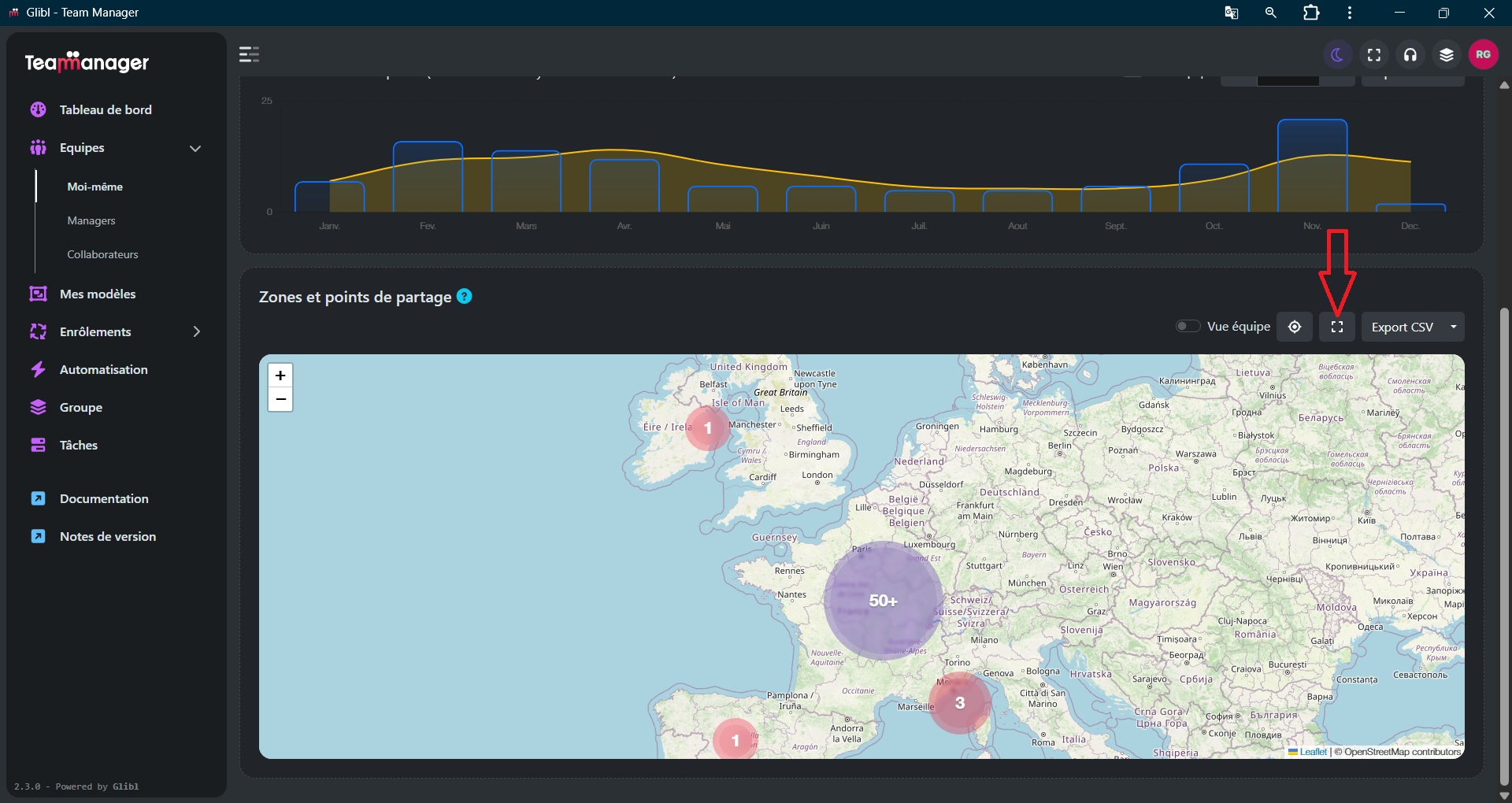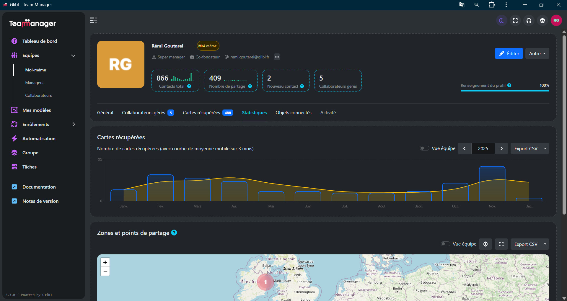 Glibl vous donne accès à un grand nombre de statistiques, dont les zones géographiques et le nombre de cartes partagées par vous et vos collaborateurs ainsi que le nombre de cartes récupérées.